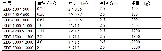 注:此表為上、下振形式振動(dòng)平臺(tái)技術(shù)參數(shù),僅供參考;此外可以根據(jù)用戶實(shí)際使用需要定做臺(tái)面大小來(lái)選用振動(dòng)電機(jī)數(shù)量及功率。