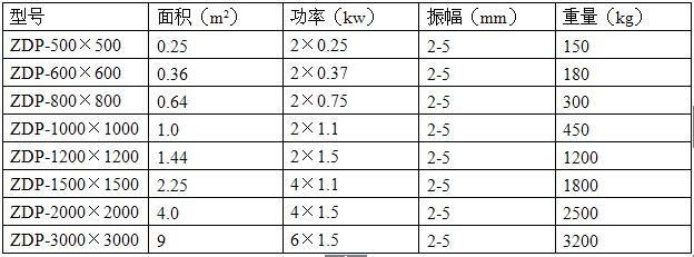 注:此表為上、下振形式振動平臺技術(shù)參數(shù),僅供參考;此外可以根據(jù)用戶實(shí)際使用需要定做臺面大小來選用振動電機(jī)數(shù)量及功率。
