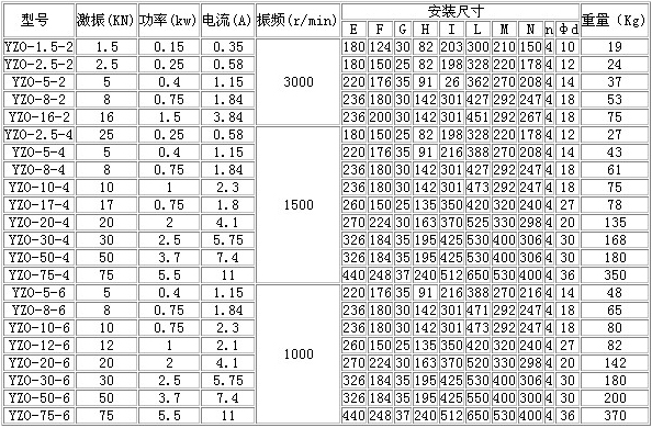 YZO系列振動(dòng)電機(jī)技術(shù)參數(shù)